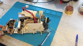 Печь работает, но поддон не вращается. Предположительно: нет контакта закрытия дверцы, неисправен привод, сгорел электромотор (либо неисправна цепь его питания).