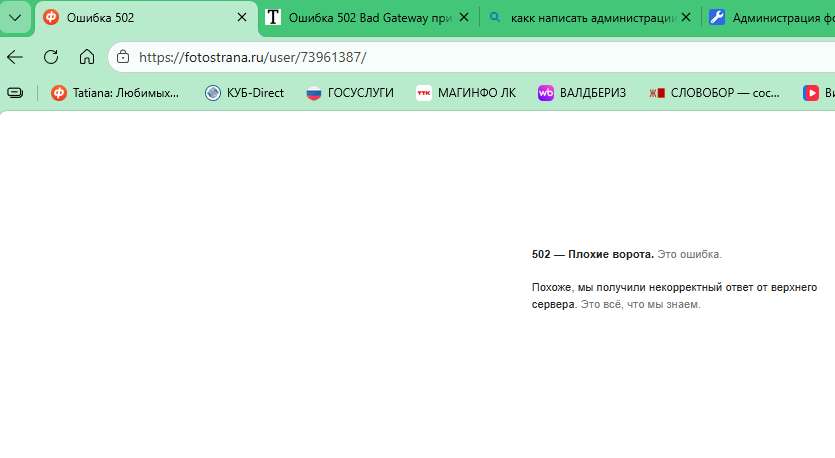 Здравствуйте! Ошибка 502 (Bad Gateway) означает, что сервер сайта временно недоступен или перегружен. Это проблема на стороне сервера fotostrana.ru, а не вашего браузера или компьютера.